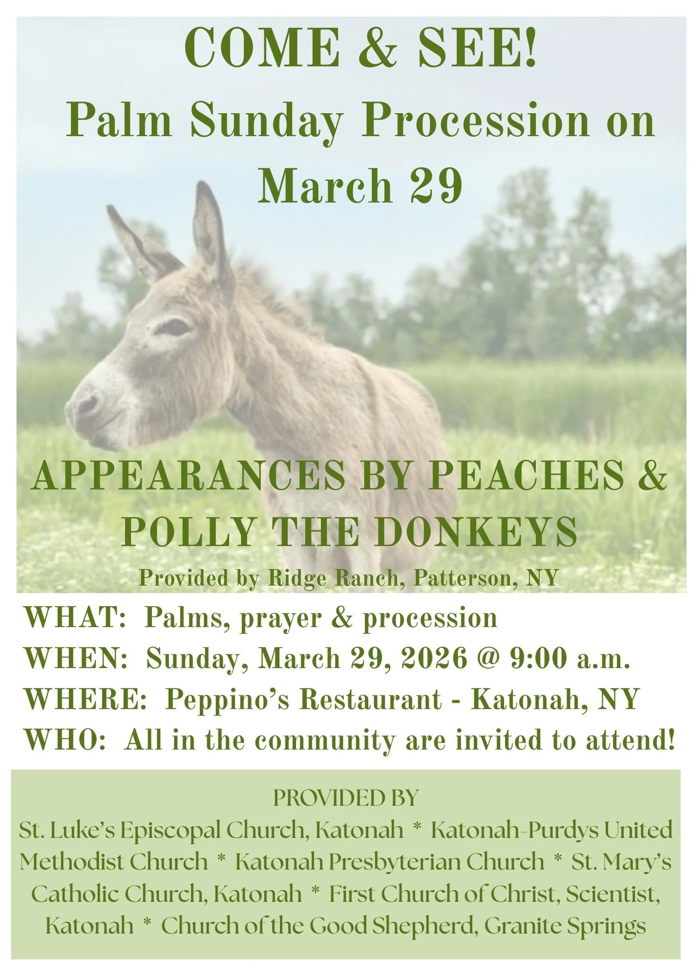Our annual Palm Sunday procession takes place this year on Sunday, March 29, 2026. Katonah churches, including Saint Luke’s congregation will again celebrate Palm Sunday with a parade through downtown Katonah beginning at 9 am at Peppino’s and ending at the Village Green before our 10 am service. Palm branches are carried during the procession to commemorate Jesus’ entry into Jerusalem led by a mama and her baby donkey courtesy of Ridge Ranch in Patterson New York.